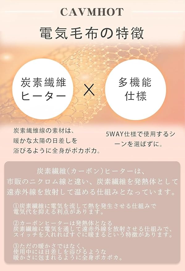 【最新の炭素繊維発熱線】内部には最新技術の炭素繊維発熱線が採用されており、優れた耐熱性と効率的な熱伝導を実現しています。これにより、まるで日光浴をしているかのような、自然で心地よい温かさを体感できます。また、消費電力が抑えられているため、省エネ効果も期待できます。安全性も高く、寒い季節に安心して長時間使用できる電熱毛布です。