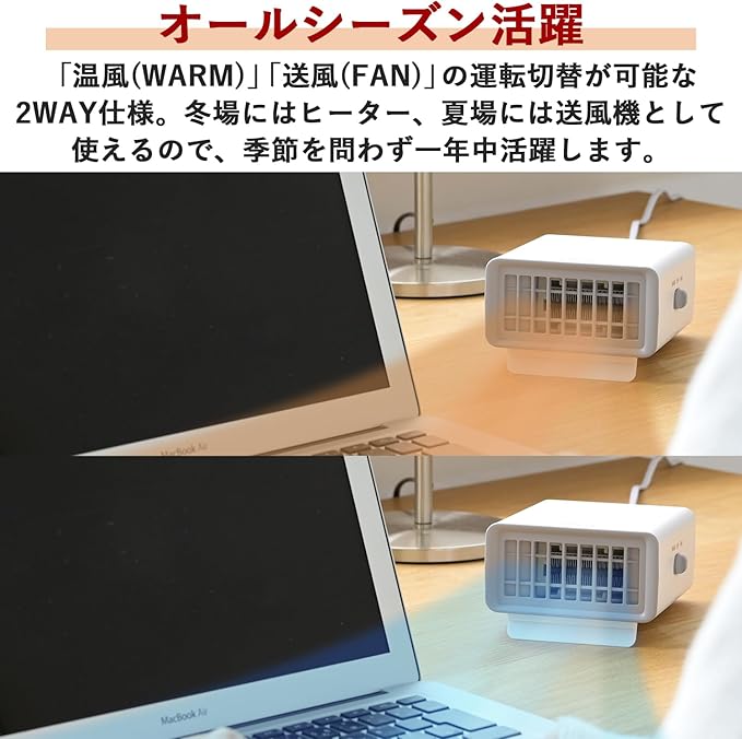 【2WAY仕様】シーンに合わせて温風/送風運転が選べる2WAY仕様。冬場にはヒーター、夏場には送風機として役立ちます。