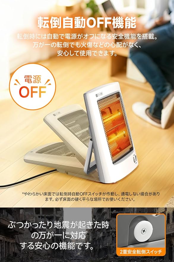【安全機能で安心使用】このストーブ 電気 は、転倒時自動OFFスイッチ搭載で、安全面も万全。小さなお子様やペットがいる家庭でも安心して使えます。また、過熱防止機能付きで、衣類乾燥やトイレ・洗面所での使用でも安全。 セラミックヒーター だから火傷や過熱のリスクを抑え、毎日の使用でも安心な 電気ストーブ 小型 です。