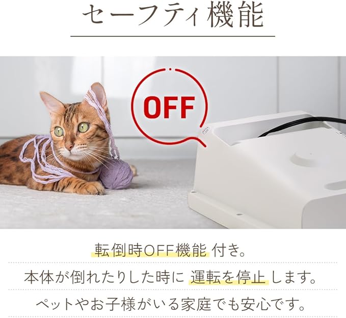 転倒防止OFF機能付き/本体が倒れたりした時に運転を停止します。ペットやお子様がいる家庭でも安心です。※転倒オフスイッチが内蔵しており