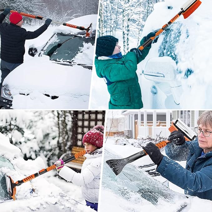 [ブラシ角度調整可] 高密度で太いブラシが雪を素早く除去し、時間と労力を節約します。ブラシのボタンを押すと、ブラシの角度を調整できる。ブラシのもう一方の端はシリコン素材で、ガラスを傷つけず、除污や排水に便利です。