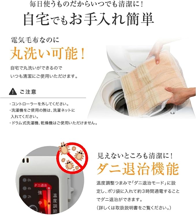 ○切り忘れても安心、自動OFFタイマー付き。(12時間自動OFF、任意6・4・2時間設定可能) ○操作しやすいスライド式温度調節。(暗い部屋でも見やすいバックライト付き) ○急に冷え込んでも快適、室温センサー内臓。(室温が約23℃以下になると、設定から自動で約3℃温度アップ) ○取扱説明書の記載手順に従いダニ退治ができます。 ○コントローラーを外して丸洗い可能。(洗濯ネットを使用して洗濯機でも洗えます。※ドラム式洗濯機、乾燥機はご使用できません。) ○頭寒足熱配線で足元はしっかり、胸元はソフトに身体を暖めます。○ご使用前に、必ず取扱説明書をよくお読みいただき、正しくお使いください。