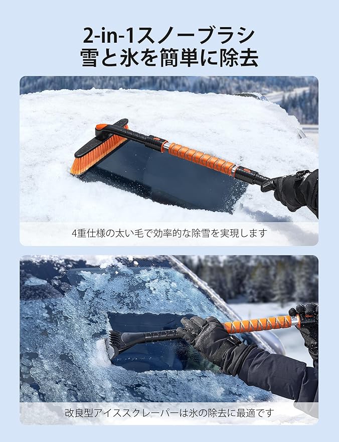 【高品質で長持ち】アルミ合金製の棒、耐久性が高いABSハンドル、固形PC素材の毛はスノーブラシの頑丈さを高めて製品の長持ちを実現します。EVAコットン材のハンドルは冬でもさわり心地の良いグリップを保証し、手が冷えずに除雪作業を簡単にできます。