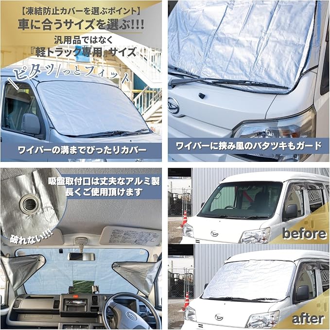【軽トラック・軽バン専用設計の雪・霜除け、凍結防止用フロントガラス保護カバー】寒い時期の降霜、積雪、凍結、汚れなどからお車のフロントガラスを守るフロントガラス保護カバーです。市販の普通車汎用タイプとは異なり、各自動車HOTの軽トラック(軽バン)に最適な専用設計となります。