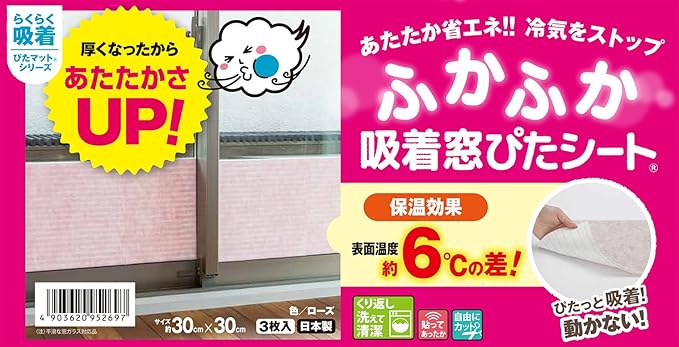 ワタナベ工業 省エネシート 冷気をブロック ふかふか吸着窓ぴたシート 30 30cm 3枚入 ローズ KPM-303F