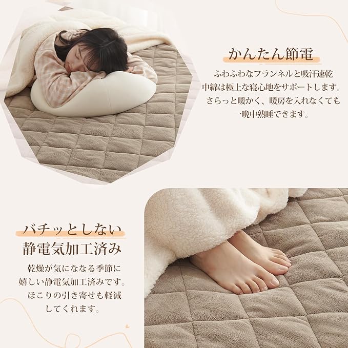 ・秋冬に大活躍できるフランネル一体型敷きパッド。マイクロファイバーからなっていて、優しい肌触りと優れた保温性を兼備し、冬を暖かく過ごしましょう!