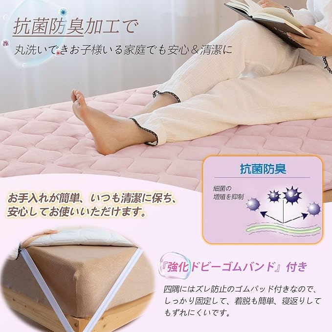 【取り扱い簡単、丸洗い可能】敷きパッドは、四隅に「強化ドビーゴムバンド」が付いており、敷き布団やマットレスにしっかりと固定できます。寝返りしてもズレにくく、取り付けや取り外しが簡単です。厚さ30cmまでのマットレスに対応可能で、洗濯機で丸洗いできます。お手入れの際には、洗濯ネットの使用をお勧めします。簡単に清潔を保ち、快適な睡眠環境を維持できます。