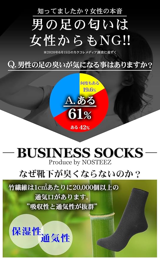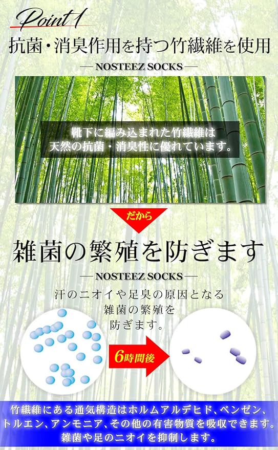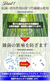 ✅抗菌・消臭作用をもつ天然竹繊維を使用しているので雑菌の繁殖を防ぎ匂いにくい靴下です