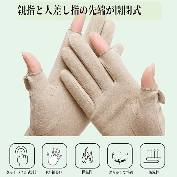 親指と人差し指の先端が開閉式:細身でシルエットが美しく、色で大変かわいいです。手袋は親指と人差し指の第一関節部分から指を出せるようになっており、スマホのようなタッチパネルも手袋を装着したまま操作可能となっています。冬手袋をしているとスマホが操作しづらいという問題を簡単に解決しました。