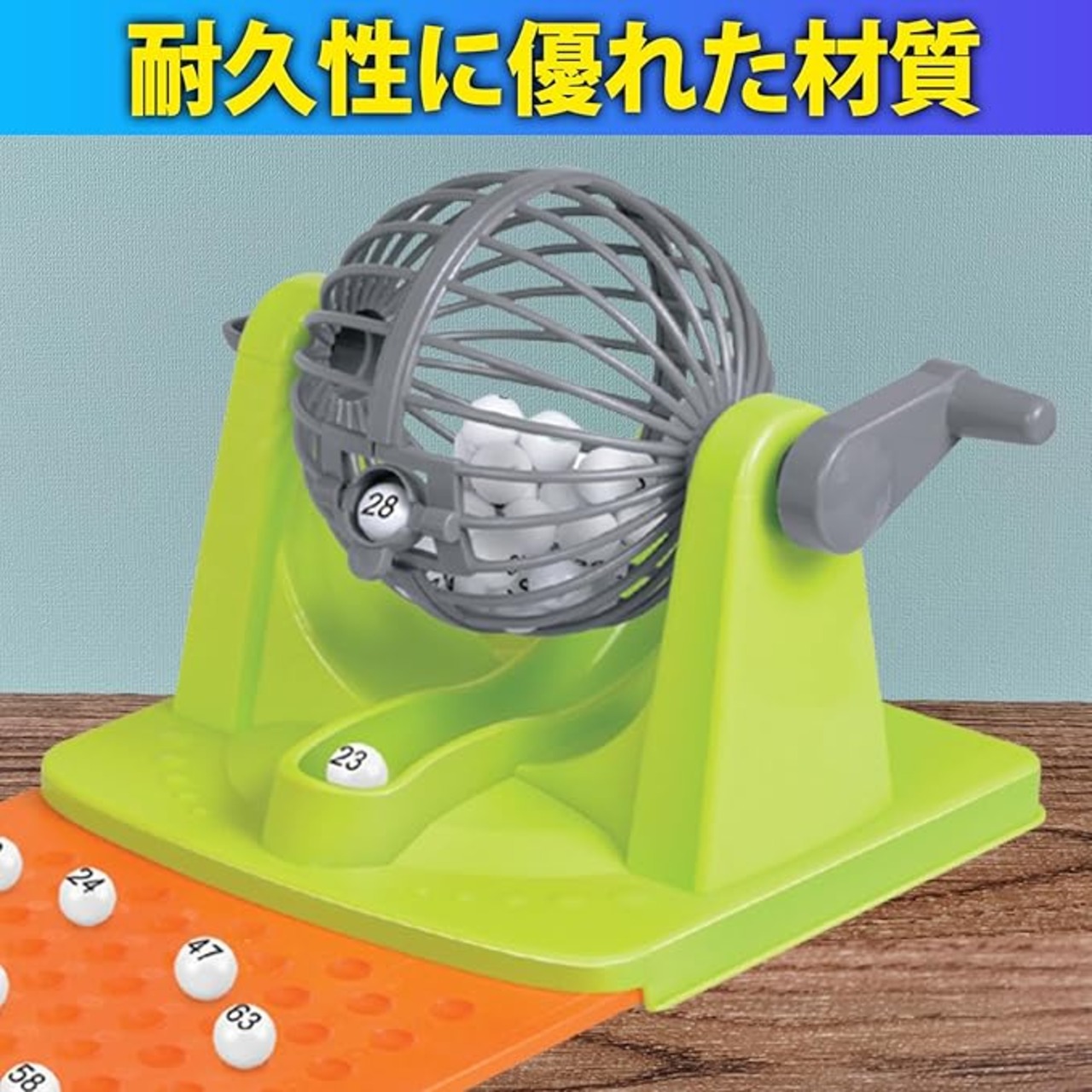 ビンゴセットは、昭和レトロなガラポンハンドル付き本体、ボール75球、カード20枚、ボールトレイ付き。軽量、耐久性に優れた素材。ルールが簡単、エンタメ性も高く、くじ引き、抽選会、多数で同時プレイ可能で便利。
