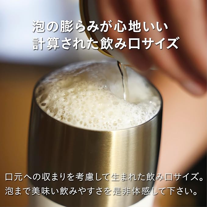 口元への収まりを考慮して生まれた飲み口サイズと泡まで美味い飲みやすさ。冷たい飲み物でも表面が結露せず、熱々の飲み物を入れても外側が熱くならない。