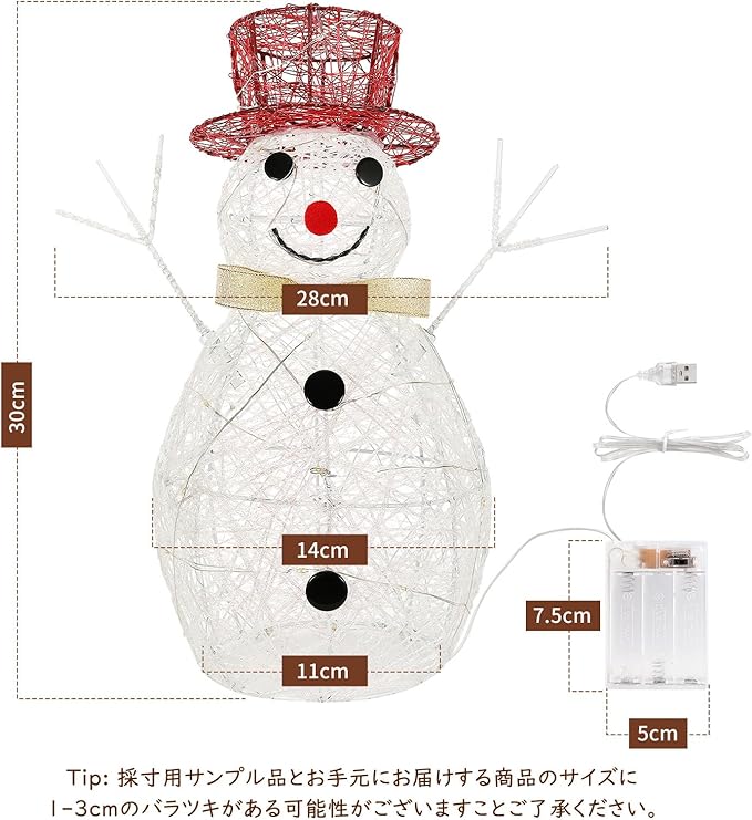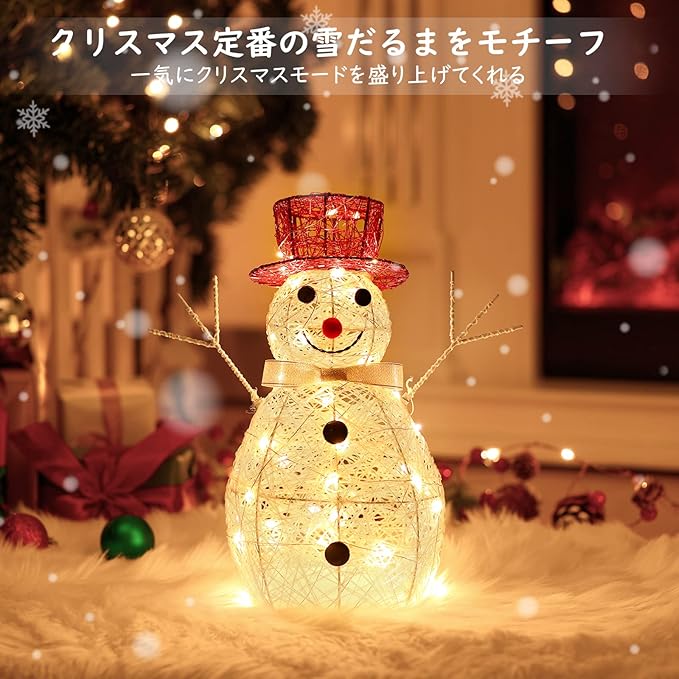 「幻想的に演出」雪だるま表面には複数のLEDライトつきワイヤーで巻かれており、3本のAA電池とUSB給電の2つ可動させる扱いやすい簡単な仕組みより、スイッチを入れるだけで、すぐに柔らかい輝きを放ち、お部屋を幻想的に演出させ、ほんわかした灯りの中で、ゆっくりとした時間を過ごせます。