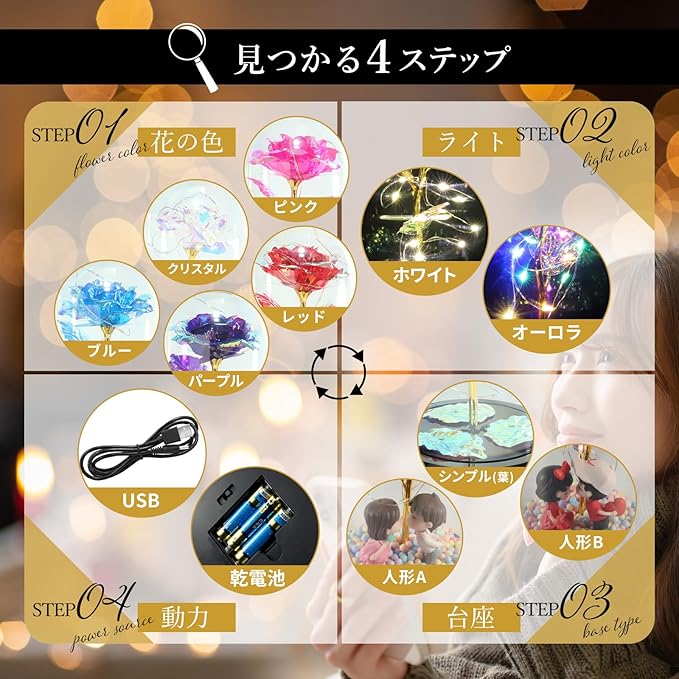 ✅【多彩なラインナップ】定番の5色のローズカラーに加え、人形モデルやクリスマス限定の卓上におけるミニクリスマスツリータイプも登場。LEDライトは華麗に煌めくオーロラライトタイプと暖かみのあるホワイトライトタイプの2種類からお選びいただけます。