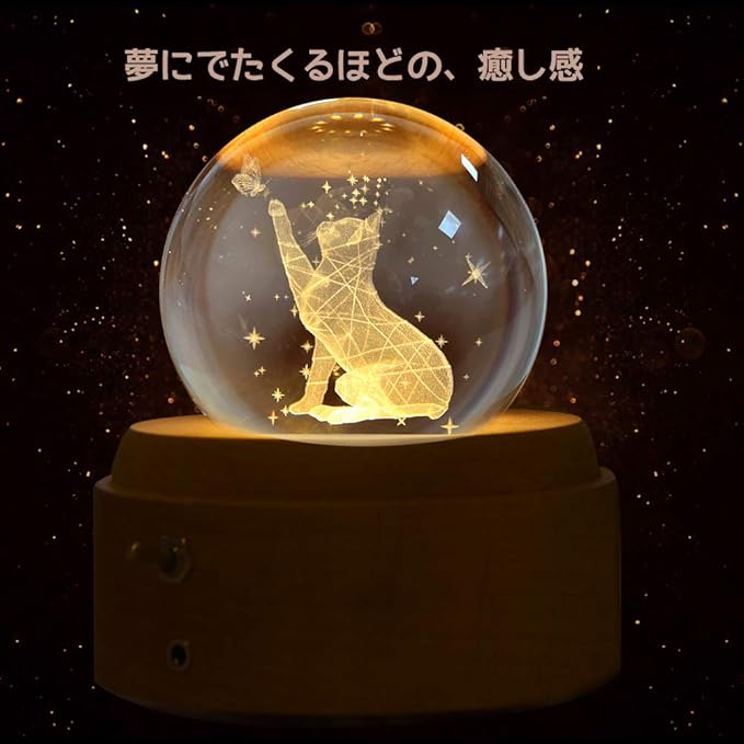 オルゴールはK9クリスタルで作られています。透明で美しい上質なクリスタルボールの内部に、レーザー光線により三次元の「わいい猫」画像を加工しております。芸術的な光と音の彫刻品!いつまでも、変わらぬ音とメロディーであなたの大切な思い出や自分時間をお守りします。曲目:ジブリでは初作品の天空の城ラピュタのテーマ『君をのせて』。