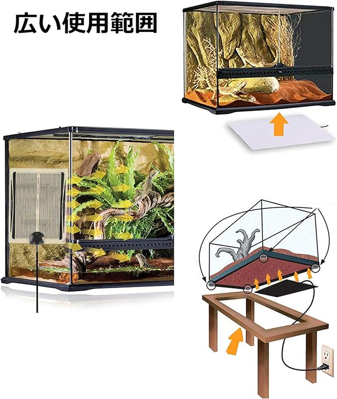 【簡単で使いやすい】パネルヒーターは軽量で薄型設計されており、飼育箱の底に簡単に設置できます。面倒な取り付け作業は必要なく、電源を入れるだけで使用できます。また、ペットのニーズに応じて、電源コード上のノブで温度を調整でき、ペットに最適な温度を提供します。