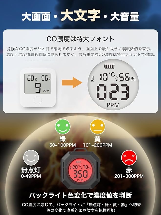 【バックライト色変化でき!一目で危険度確認】数字だけでなくバックライト色:緑(50-100PPM)→黄(101-200PPM)→赤(201PPM以上)の変化で安全・注意・危険を瞬時に判断。暗いテントや車内でも、直感的に状況を把握できる安心設計です。【大画面・大文字!安心確認】2025年新設計!大画面・大文字で、一酸化炭素濃度の変化がさらに分かりやすくなりました。一酸化炭素チェッカーは手のひらサイズながら、直径4.1cmの大型LCDディスプレイ(他の製品と比べて約380%大きくなる)を搭載し、やや離れた場所からでも一酸化炭素濃度をはっきり確認可能です。特に危険なCO濃度は画面上で最も大きく表示され、温度・湿度情報も同時にチェックできるため、テント・車内などさまざまな環境で安心です。