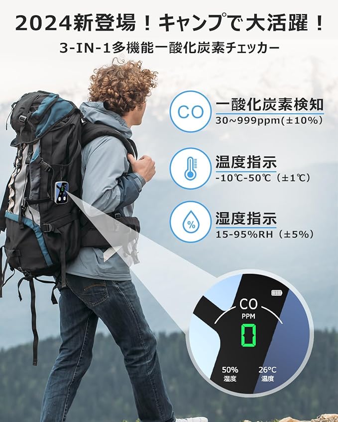 一酸化炭素チェッカー ポータブル一酸化炭素チェッカー キャンプ用 一酸化炭素 Type-c充電式 アラーム 車中泊 冬キャンプ用 (ホワイト)