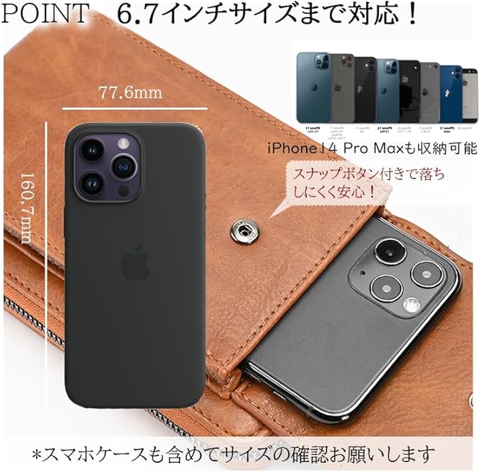 【大きめのスマホも入ります。】フロントポケットのサイズは約170 100mmで、iPhone14ProMax(77.8 160.7 7.85mm)も収納可能です。本体サイズは長さ200 幅160 奥行45㎜、重さは本体で196g、ストラップ長さは53-105cmで調整が可能です
