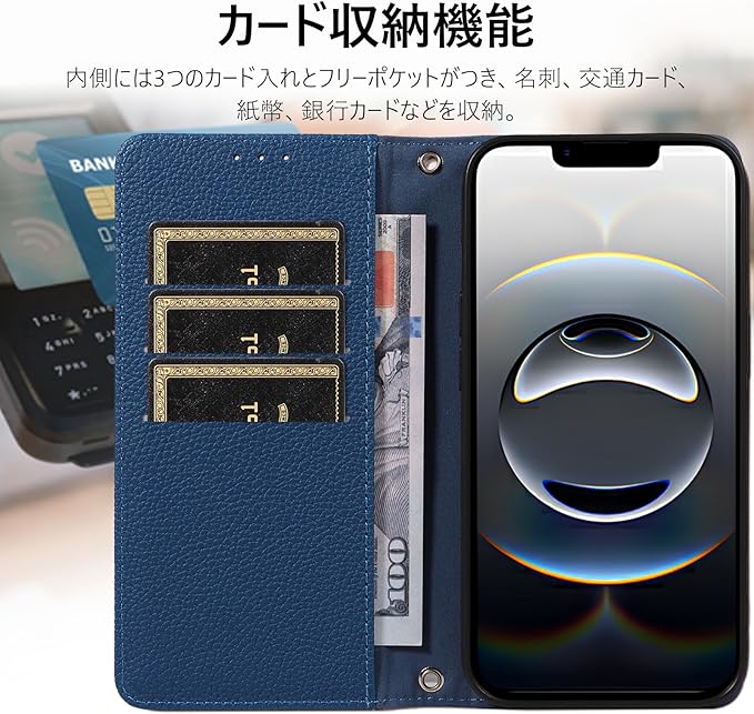【カード収納機能&隠しマグネット設計】phone16e用 ケース 手帳型の内側には3つのカード入れとフリーポケットがつき、名刺、交通カード、紙幣、銀行カードなどを収納、外出時はこのケースを携帯するだけで十分、日常の生活に便利です。マグネットが内蔵されているので、ベルトがなくても蓋がしっかりと閉まります。閉じたままスマートに通話可能。電源ボタン、音量ボタン等の機能が自然に使えます。