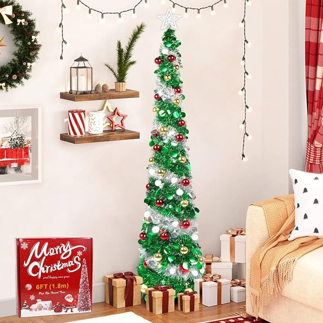 クリスマスツリー ポップアップ式 180cm トップ星&飾り付き クリスマスツリー スリム 折りたたみコンパクト収納 キラキラ星 クリスマス飾り 被せて完成 お洒落で存在感 クリスマス・新年 北欧オーナメント 組立簡単 説明書 YHANEC (グリーン&シルバー)