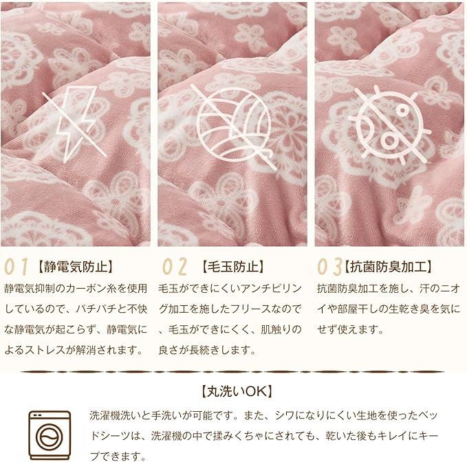 【静電気防止加工&丸洗いOK】不快なパチパチ感を和らげるため、毛玉ができにくいアンチピリング加工を施したフリースなので、毛玉ができにくく、肌触りの良さが長続きします。起毛させた生地は、布団本体との摩擦でどうしても毛玉ができてしまいます。現段階では、「毛玉ゼロ」はありえません。少しでも毛玉を軽減する対策として、月2回のお洗濯をおすすめ致します。お洗濯の際は表・裏を交互に洗ってください。