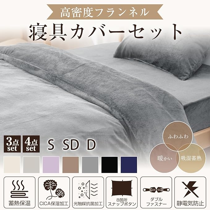 Housecover 寝具カバーセット フランネル生地 布団カバー 掛け布団カバー ファスナー仕様 ボックスシーツ 全周ゴム付き 枕カバー 合わせ式 ベッドシーツ 敷き布団カバー 洋式・和式兼用 洗い替え用 あったか マイクロファイバー 洗える 発熱 保温 静電気防止 丸洗いOK 冬 グレー シングル