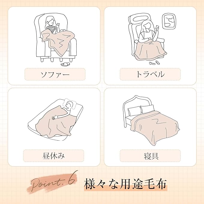 【オールシーズン向け】程よい厚ささ、薄づきず厚さ分けしません。春夏秋冬、一年中使える、最高のパートナーです。暖かくなってきたら毛布1枚で、体にフィットして冷たい空気をガードします。秋冬の不安定な気温時は肌掛け布団として使ったり、布団と組み合わせて使ったりして、温かみをもたらします。夏には冷房対策、冬には足元の冷え対策、そしてあらゆる場所で大活躍。