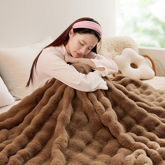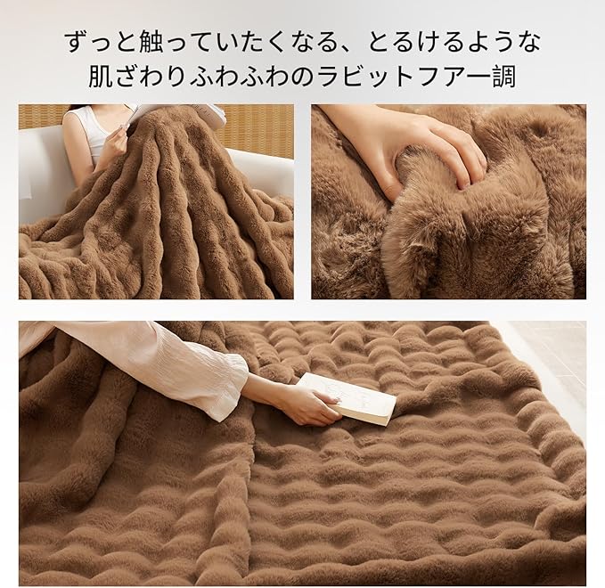 【二枚合わせ毛布、保温性アップ!】本毛布は表裏側全部上質のラビットファー調生地:表側は長めの極細繊維、内側は短めの極細繊維で仕上げており、高い保温性と、ふんわりとした極上の肌触りを両立しました。おしゃれなデザインで、日々のくつろぎタイムを温かく彩ります。