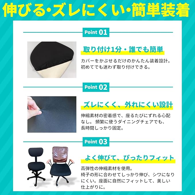 【伸縮素材でしっかりフィット】 ポリエステルとスパンデックスを使用したストレッチ生地。 座面の形に合わせて自然に伸び、ズレにくい設計です。