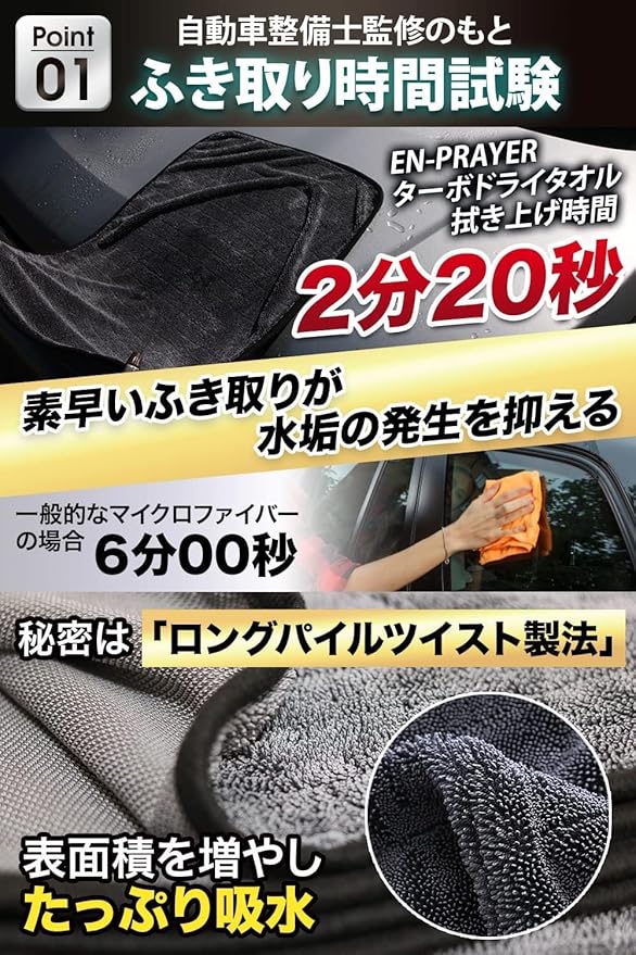 【拭き上げ時間比較試験実施】ターボドライタオルを使うことで、一般的なマイクロファイバータオル(マイクロファイバークロス)の半分の時間で拭き上げ可能。素早い拭き上げが水垢の発生を抑えます。洗車タオル