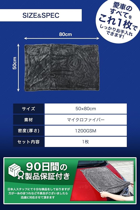 【仕様】サイズ50x80cm/1枚です。ロングツイストマイクロファイバーを使用しており、細かい繊維が水分をスムーズに吸収します。ボディーやガラスにタオルを乗せて引っ張るだけでだけで、驚くほどに表面の水分を一瞬に拭き取り、素早く乾かすことができます。また両面マイクロファイバーなのでひっくり返して拭くことが可能です。