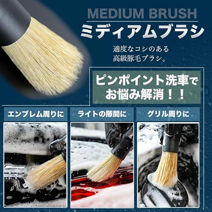 ✅【ミディアム】: 豚毛ブラシ。主に車のロゴ、車のグリル、ヘッドライトの隙間、車体の隙間などのやや硬い部分の清掃に使用されます。