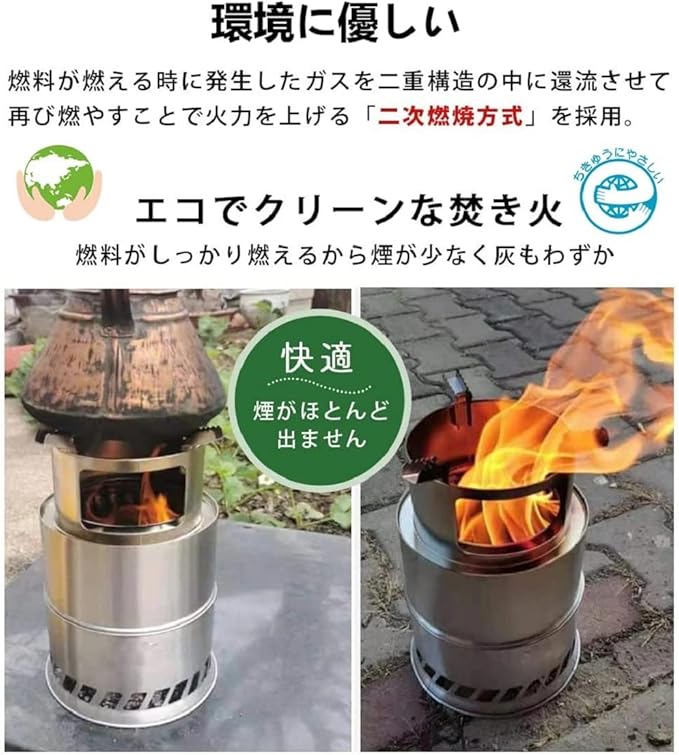 ウッドストーブ 大型 ソロ 二次燃焼 キャンプ 焚火台 約φ20 h31cm 軽量 コンパクト 持ち運び便利 ステンレス 五徳 熱効率 (大型(約)Φ20 h31cm)
