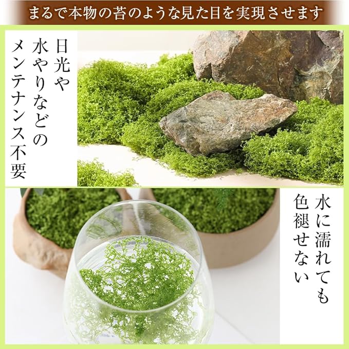 実際の苔とは異なり水やりや定期的な換気の必要が無いだけでなく、日当たりも気にせずにご使用いただけます。水に浸けていても色褪せないため、長期間鮮やかな色味をキープできる嬉しい仕様です。