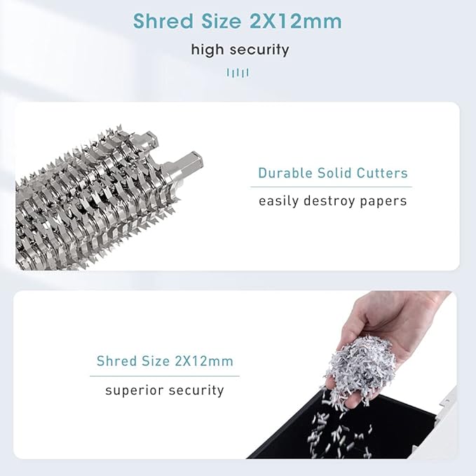 【強力な細断】iOCHOWシユレツダーは先端の細断技術が使用され、カットサイズは約2x12mmのマイクロカットタイプです。すべての文書が高速裁断できます。情報が読み取りにくく、重要情報の流出が防止できます。細密シュレッダーは出荷前に細断テストを行います。細断テスト後は細断くずの除去を行っていますが、カッター刃などに付着した細断くずが輸送中に落下し、ダストボックスや家用シュレッダー本体に残っている場合がありますので、あらかじめご了承ください。