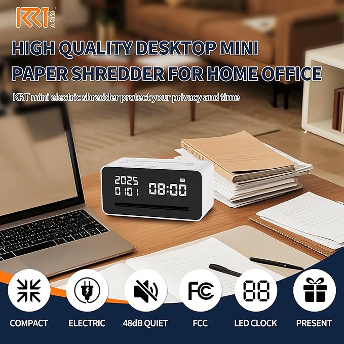 KRT 小型シュレッダー デスクトップ LED時計表示付きで、高齢者の方にも使いやすい設計です。 小型シュレッダーながら、コンパクトで省スペース、持ち運びも可能です。 メモ、レシート、はがきなどの書類を簡単にシュレッドでき、プライバシーを保護します。 さらに、電動シュレッダーとしての高性能で、毎日の書類処理をスムーズにサポート。 家庭やオフィスでの使用に最適な小型シュレッダーです。