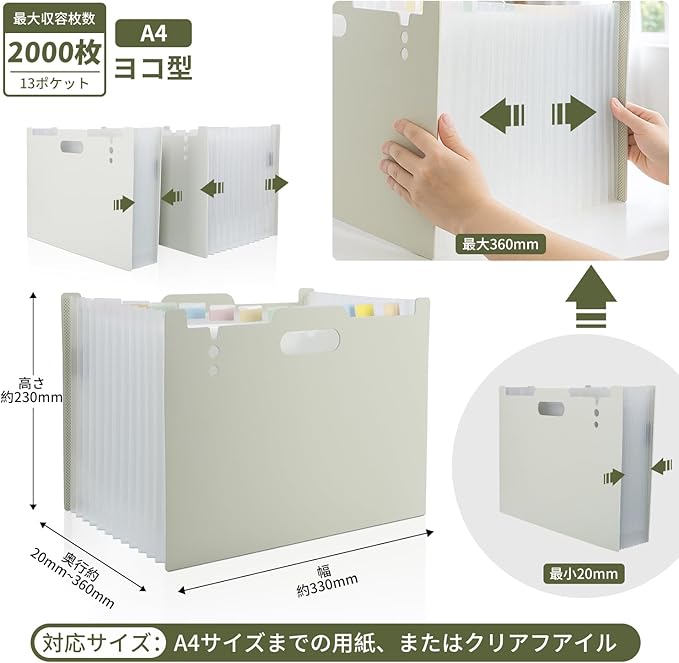 【幅広い用途】13ポケット拡張ファイルフォルダ、A4用紙約1000枚収納できます。資料、カード、通帳、伝票、封筒、領収書、プリント、書類、しおり等の分類整理に便利です。自宅、オフィス、学校、書斎など、さまざまな場所でファイルやメモを保管するのに最適です