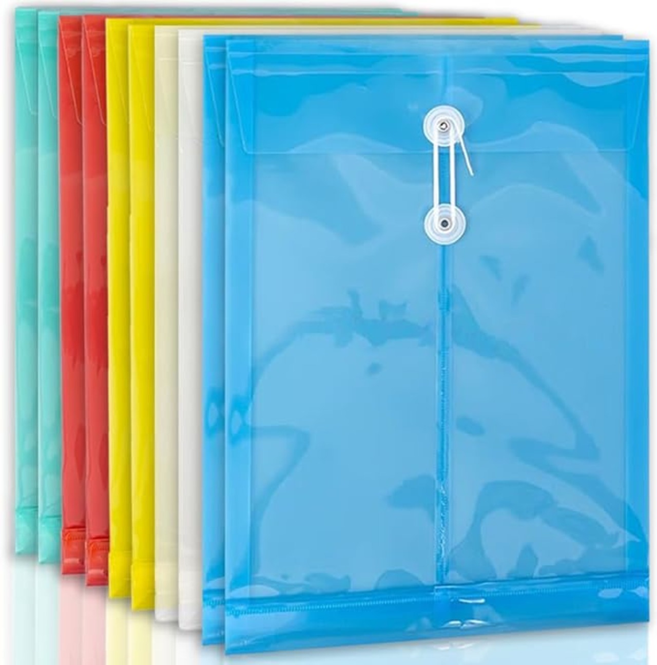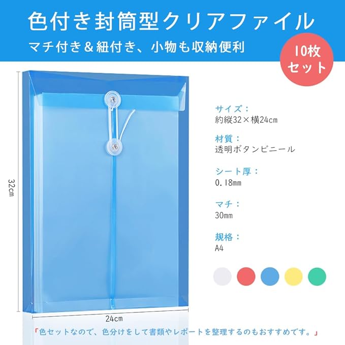 色付きの収納性の高い封筒型ファイルケース パッケージ内容:カラフルファイル封筒型x10枚 サイズ:約縦32x横24cmxマチ約3cm 材質:ポリプロピレン(PP)。色:5色セット(レッド、ブルー、グリーン、イェロー、クリア)厚口:0.18mm マチ付きので大量の用紙をはじめ、小物などもまとめて保管できる、重要書類を持ち運ぶときは、しっかりと紐で閉じられるハトメ&紐付きタイプのファイルバッグです。