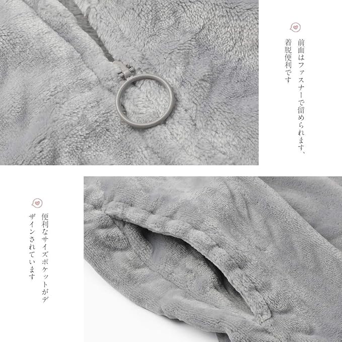 ★【デザイン】着用できる毛布/ルームウエアです。袖が付いてるので読書やパソコンなどをしたい時も両手が自由に使える、そして十分の長さがあるので肩から足先まで暖かく包み込めます。前面はファスナーで留められます、着脱便利です。大きなフードとポケットが付いているので、頭と手を暖められるほか、収納力もたっぷりのパジャマです。