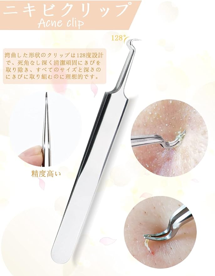 【5本セット】ニキビ取りツールは色々な用途に適しています。顔、鼻周りなどの角栓、黒ニキビ、白ニキビの除去に使用する専用スティックセットです。ニキビや黒ずみだけでなく、毛抜きとしても使用できます。