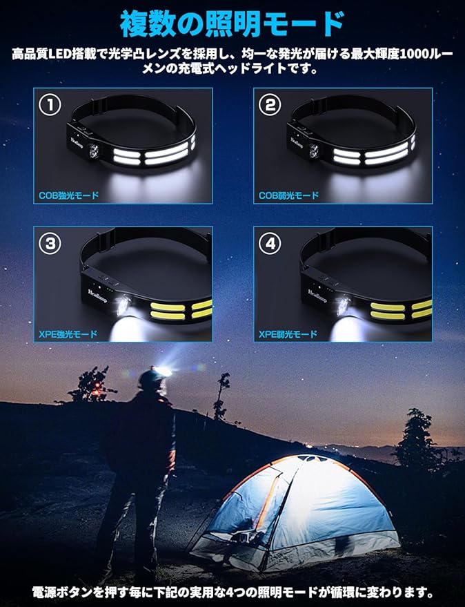 【4種の点灯モード】へっどらいとは4種の点灯モードを提供:集光高輝度,集光低輝度,散光高輝度,散光低輝度。