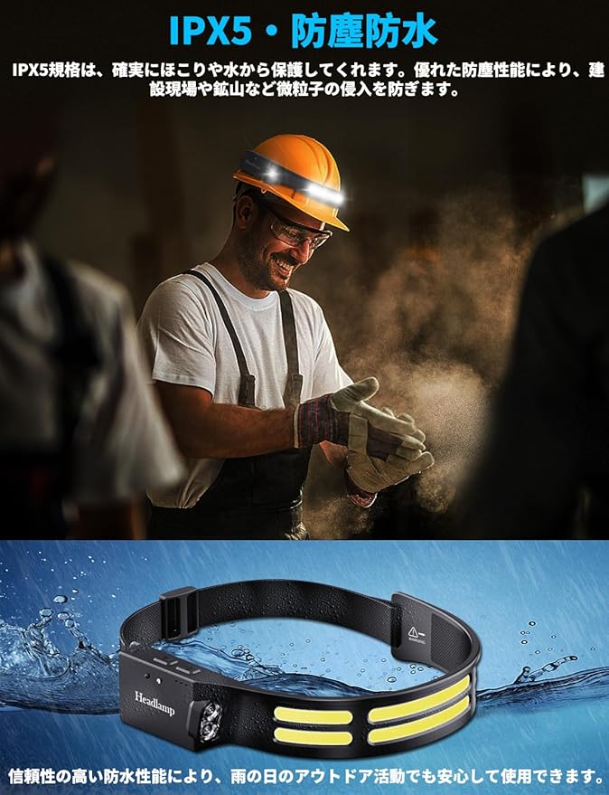【手を振ることで作動するモーション】内蔵チップは、あなたの指示を感知して、いつでもオン・オフを切り替えることができ、両手を照明のために解放することができる。快適で調節可能なヘッドバンドが付属しているので、ヘッドランプを使えば、仕事、冒険、遊びに両手を自由に使える。