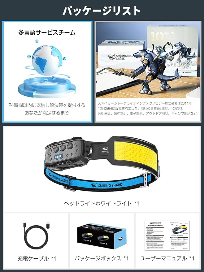 Smiling Shark ヘッドライト, 【LED白&赤ヘッドライト 1個入り】USB充電式 7倍高輝度照明 5000 mAh 長時間使用 人感センサー付き IPX4防水 防塵 釣り 登山 散歩 懐中電灯 キャンプ 作業 災害 停電 最適