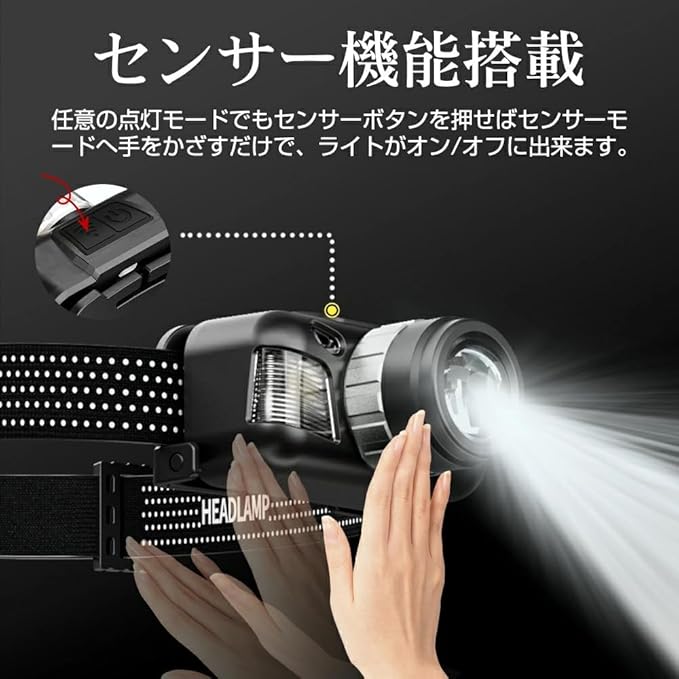 ヘッドライト USB充電式 大容量1200mAh 高輝度 LED 800ルーメン 手振りセンサー機能付き 4種点灯モード 防水防塵 30 角度調整可 最適 登山 キャンプ 散歩 作業 夜釣り アウトドア 災害 停電用 小型 超軽量 ヘッド ライト