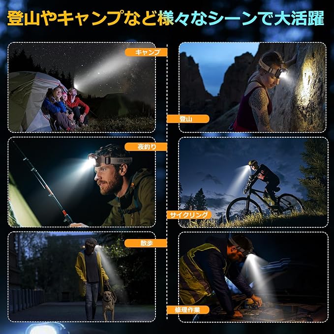 【IP65防水・アウトドアに大活躍】led ヘッドライトはIP65防水性能を備えているため、外の急雨でも水の浸入を気にせず安心して使用できます。落下衝撃にも耐える頑丈な構造であり、過酷な環境下でのシーンにも充分活用できます。 キャンプ、夜釣り、自転車ライト、登山、ランタン、停電、防災、地震対策、車のメンテナンス、読書、操作灯、その他の家庭用照明で広く使用されています。