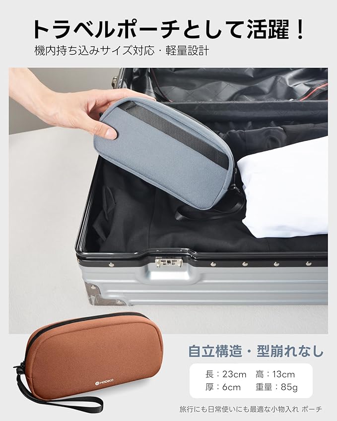 【軽量設計で携帯に最適】 重量わずか85gの超軽量素材を採用したこのポーチは、リュックサックやスーツケースに追加しても負担ゼロ。通勤ラッシュや空港移動時でも疲れ知らずの携帯性を誇り、旅行中の荷物増加を気にせずガジェットを持ち運べます。コンパクトサイズ(23 13 6cm)ながら大容量を実現し、収納ポーチとしての機能性と軽量性が、多忙な現代人のライフスタイルに最適です。