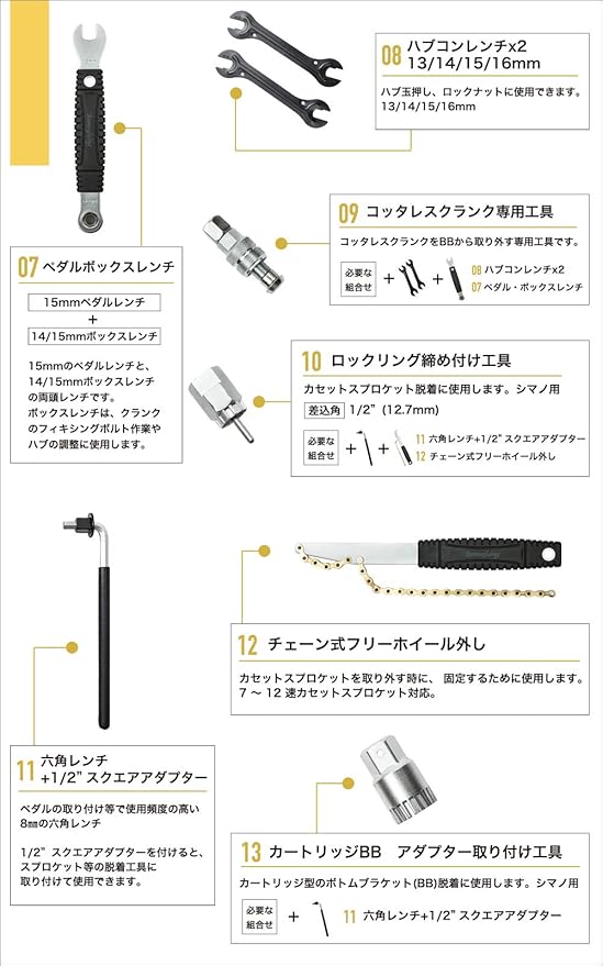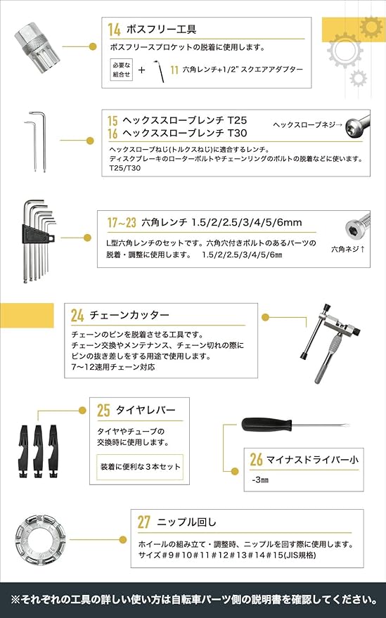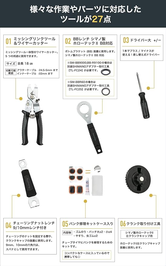 ♂️【高品質な台湾製】自転車 工具セット ロードバイク メンテナンス SIG-BX001 ●内容:自転車工具セット全27点 ①ミッシングリンクツール&ワイヤーカッター ②BBレンチ シマノ製ホローテックⅡ BB対応 ※SM-BB9000,BB-R9100 の場合は別途SHIMANOアダプター取付工具TL-FC24 が必要です。※SM-BBR60の場合は 別途SHIMANOアダプター取付工具TL-FC25 が必要です。③ドライバー大 +/- ④チェーンリングナットレンチ 9/10㎜レンチ付き ⑤パンク修理キット ケース入り ⑥クランク取り付け工具 ⑦ペダル・ ボックスレンチ ⑧ハブコンレンチx2 13/14/15/16㎜ ⑨コッタレスクランク専用工具 ⑩ロックリング締め付け工具 ⑪六角レンチ+1/2”スクエアアダプター ⑫チェーン式フリーホイール外し ⑬カートリッジBB アダプター取り付け工具⑭ ボスフリー工具 ⑮⑯ヘックスローブレンチT25・30 ⑰~㉓六角レンチ 1.5/2/2.5/3/4/5/6㎜ ㉔チェーンカッター ㉕タイヤレバーx3 ㉖マイナスドライバー小 ㉗ニップル回し
