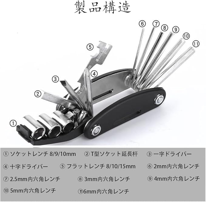 1:【16in1多機能】2/2.5/3/4/5/6mm六角棒レンチ、8/10/15mm六角ボルトレンチ、プラス(+)ドライバー、マイナス(-)ドライバー、ソケット取付バー、8/9/10mmソケットレンチ。自転車の修理、整備、点検、メンテナンスなどのとっさのトラブルに対処できる工具セット。