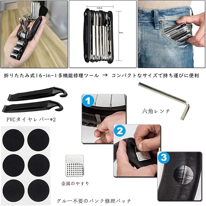 ♀️【バイク パンク修理キット内容】16-in-1多機能修理ツール、六角レンチ、PVCタイヤレバー、コンパクトツールバッグ、グルー不要のパンク修理パッチ、やすりが含まれています。