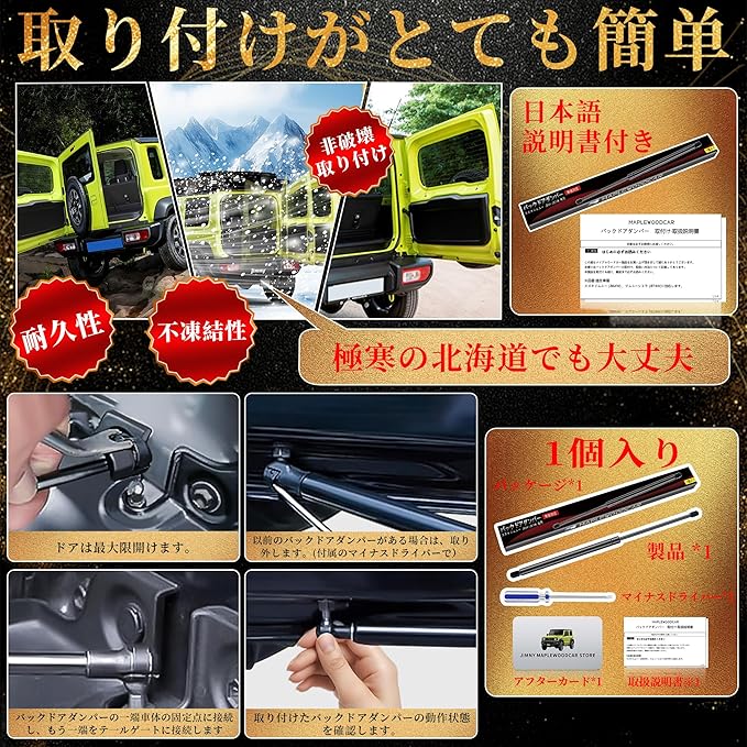 【アフターサービス】 製品到着後ご不明点がございましたら、取扱説明書記載の方法でお問い合わせください。 保証期間:2年 対応時間:1:00-24:00 連絡方法:保証書記載のLINE ID/G-mail/Youtube/Amazonアカウント ※10年間ジムニー専門HOTとしての技術力をご体感ください。
